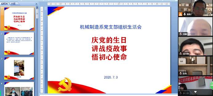 7月3日下午,机械制造系党支部召开主题为“庆党的生日,讲战疫故事,悟初心使命”的线上组织生活会,支部书记蒋新广主持会议,支部全体党员参会。