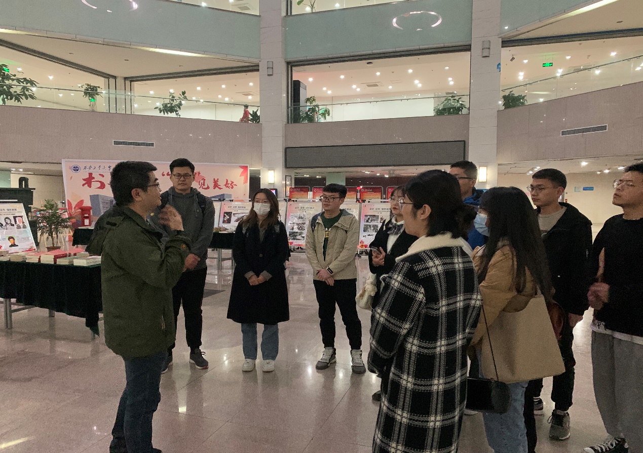 此次展览特别邀请到图书馆抗美援朝图片展讲解员陈松谷老师进行讲解,讲解中陈老师以历史时间为线索,讲述了20世纪50年代朝鲜半岛局势和抗美援朝历史背景,并详细讲述了抗美援朝战中涌现的民族英雄,讴歌了他们大无畏的民族精神,为支部成员带来一堂生动的思政大课。