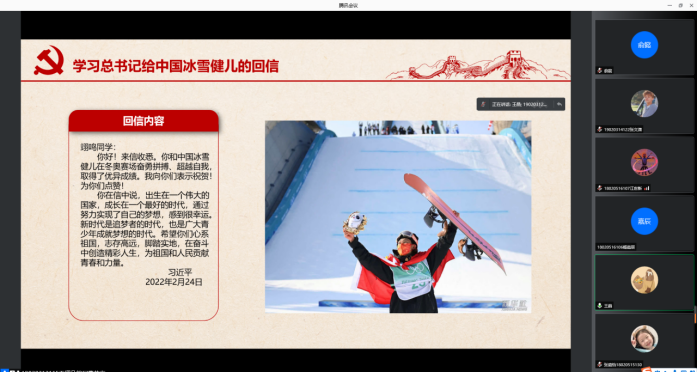 亲切关怀激荡奋斗豪情,巨大鼓舞砥砺前进征程。2022年3月29日,公司员工第五党支部线上开展学习《习近平总书记给中国冰雪健儿的回信》活动。支部组织委员王熠凡主持本次活动,全体支部同志参加。