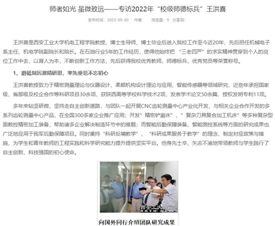 运用机电教工党员之家、公司党员工作群、公司网站等平台,线上线下结合,加大对师德师风标兵、优秀教师、优秀共产党员先进事迹的宣传弘扬。目前已完成一期《师者如光虽微致远——专访2022年“校级师德标兵”王洪喜》。