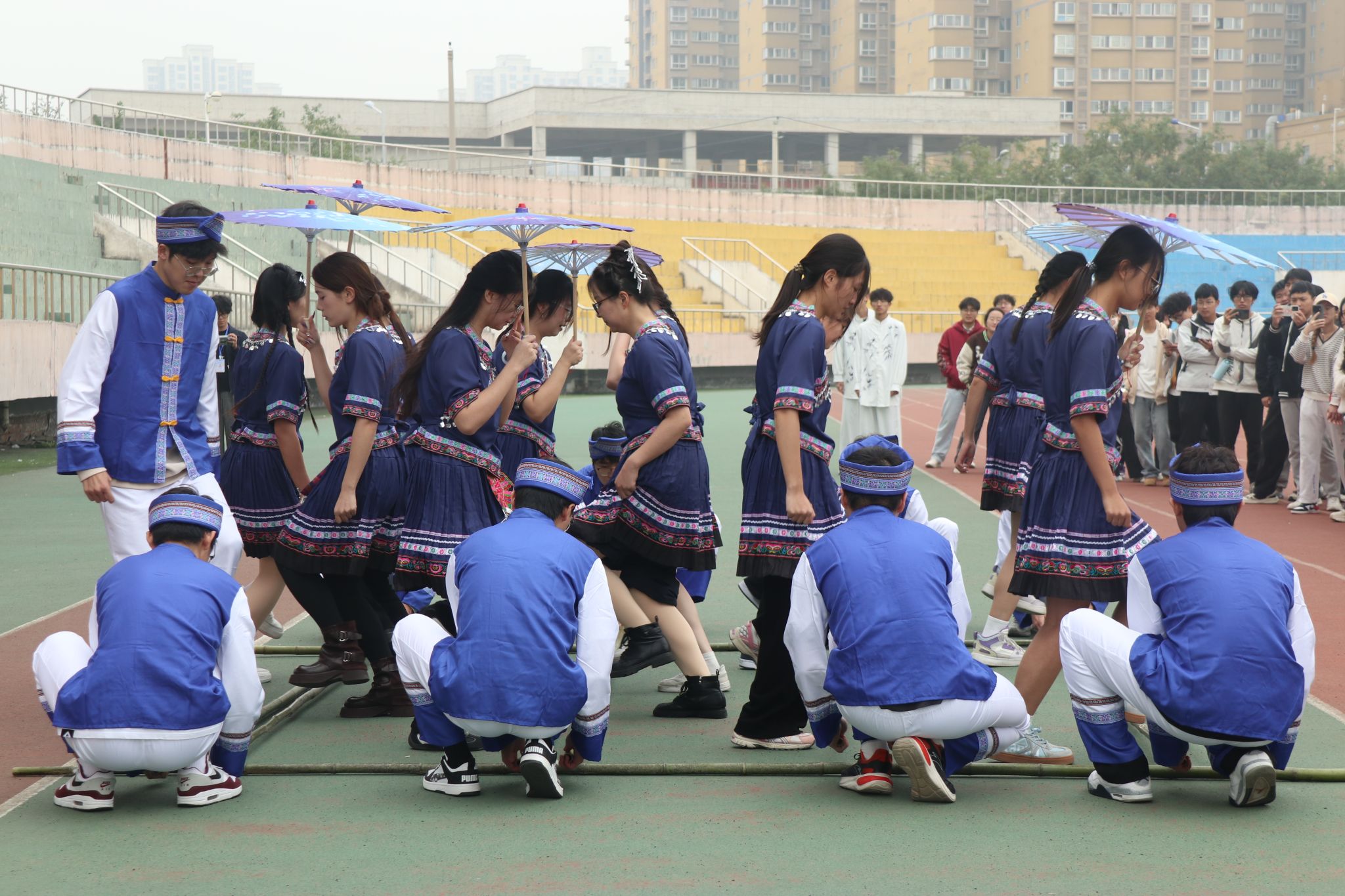 开幕式上,民族传统体育项目表演精彩登场。黎族和壮族同学带来的《竹竿舞》率先亮相,清脆的竹竿敲击声与同学们灵动的舞步相互呼应,将少数民族文化的鲜活与热情展现得淋漓尽致;紧接着,武术协会成员带来传统武术表演,一招一式刚柔并济,尽显中华武术的深厚底蕴与独特魅力,赢得现场观众阵阵掌声与欢呼。表演结束后,马福郑重宣布本届民族传统体育项目运动会正式开幕。