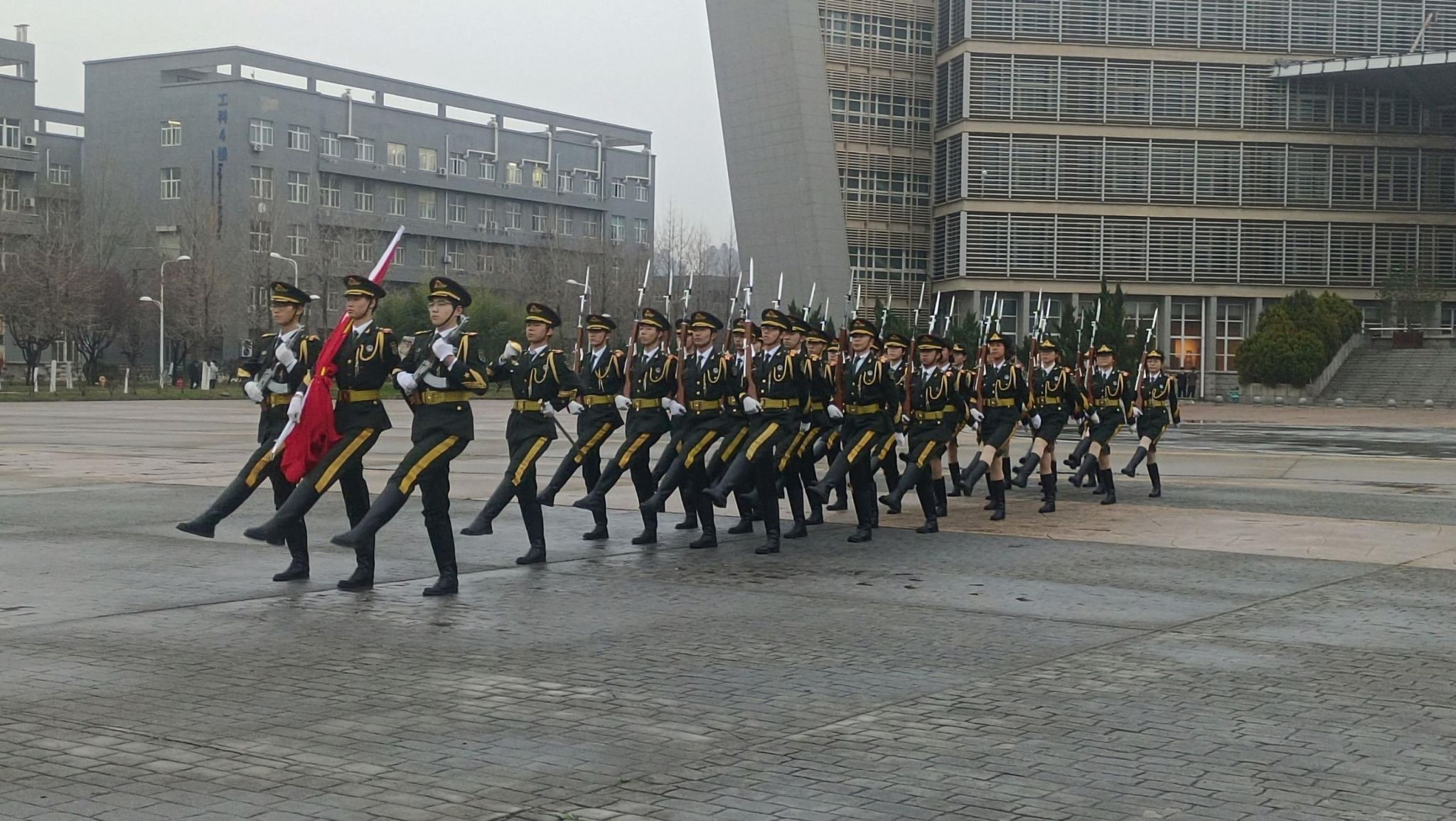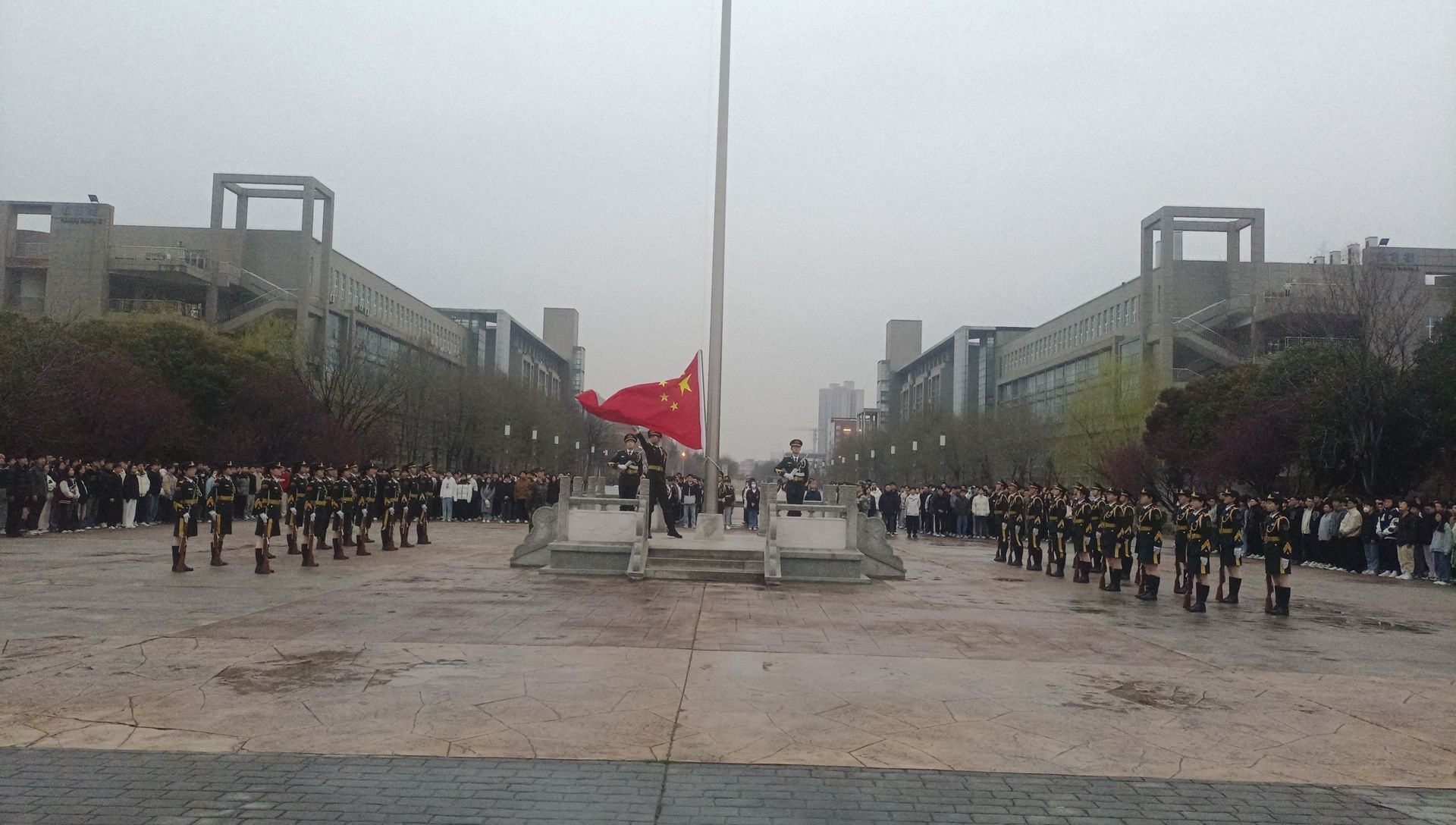 伴随着庄严激昂的国歌声,国旗护卫队迈着坚定的步伐,护送着鲜艳的五星红旗缓缓入场。全体师生肃立注目,深情地凝视着国旗冉冉升起,心中涌动着对祖国的无限热爱和敬意。