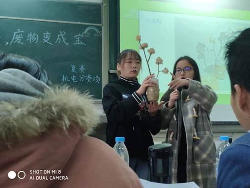 比赛伊始,主持人刘悦致以开场词并宣读评分标准。首先进行比赛第一个环节:变废为宝创意赛。待刘锐宣布比赛规则后,参赛人员按顺序上台进行两分钟的限时讲解,与此同时评委对参赛作品进行现场评分。参赛人员积极上台向大家展示和介绍自己的作品,甚至有些作品已经使用于生活当中。休息约十分钟之后,比赛进入了垃圾分类小达人比拼环节。每组队伍派出一名队员上场并将写有垃圾名的卡片投放进贴有垃圾类别标签的四个盒子中。每轮有五组队伍竞赛,每组限时两分钟。最终统计正确分类的卡片数即为得分数。第二个环节竞争激烈,赛场气氛活跃。活动接近尾声,工作人员播放了一段关于垃圾分类的视频。至此,活动圆满结束。