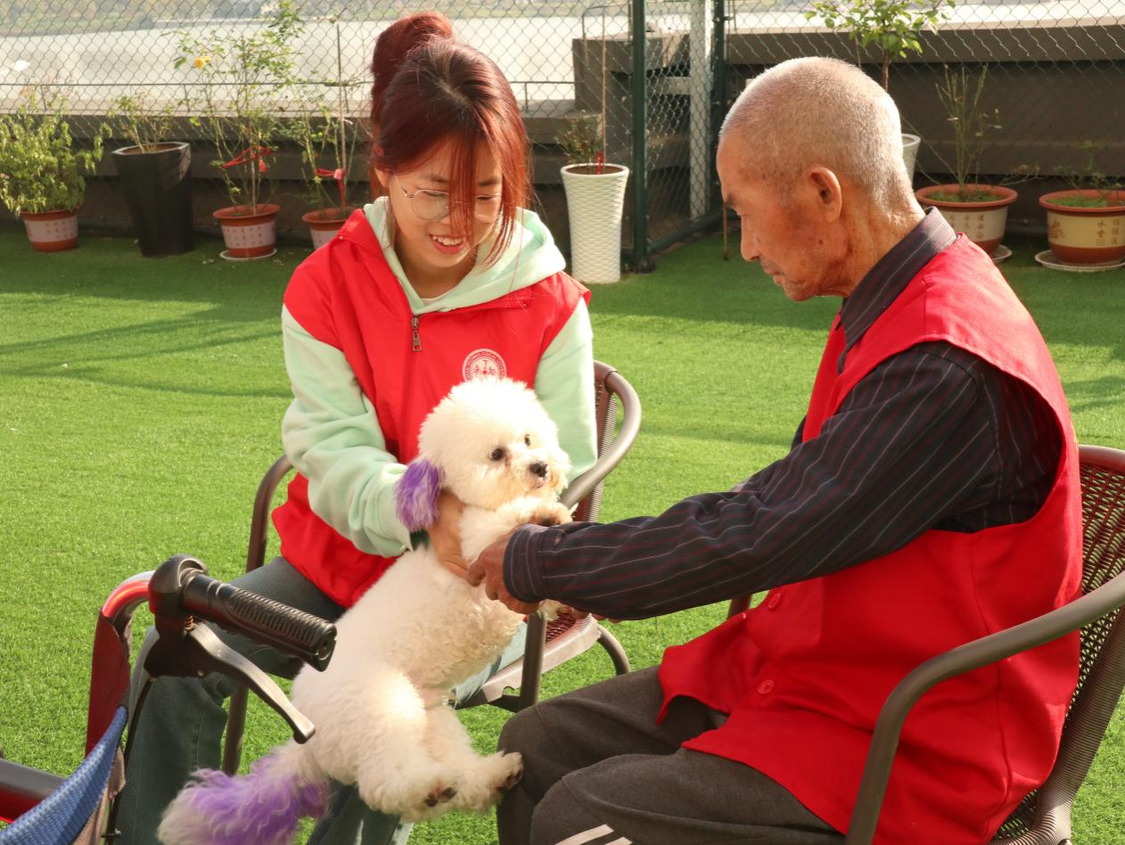 打扫完成之后,同学们开始和老人们互动、聊天,同学们各自发挥自己的优势,根据老人的喜好用不同的方式陪伴着他们,通过陪老人写字、下象棋、唱歌、打扑克等活动融入老人的生活中,让他们真真切切地感受到了来自社会、来自青年的关爱以及生活的美好与快乐。