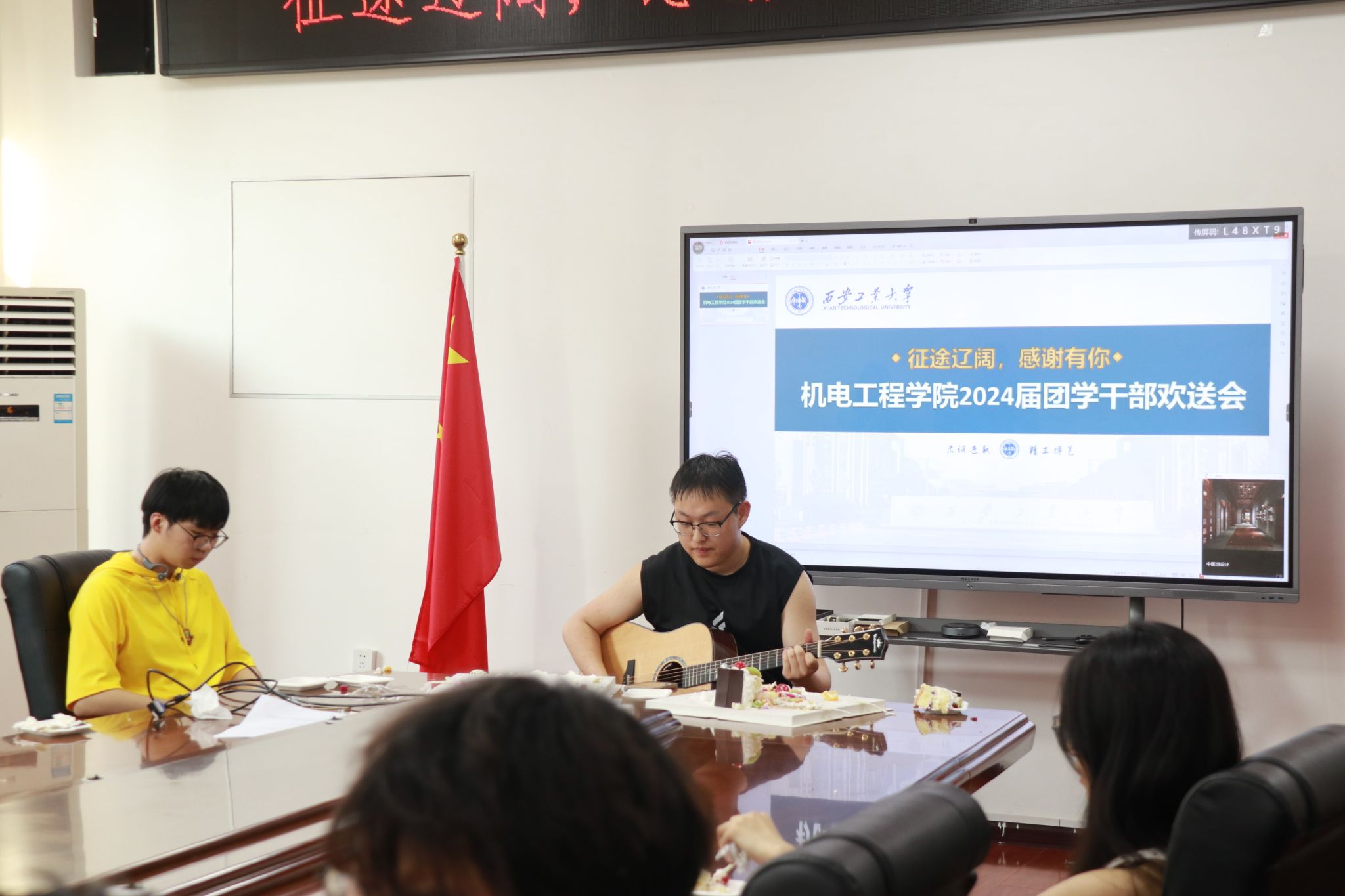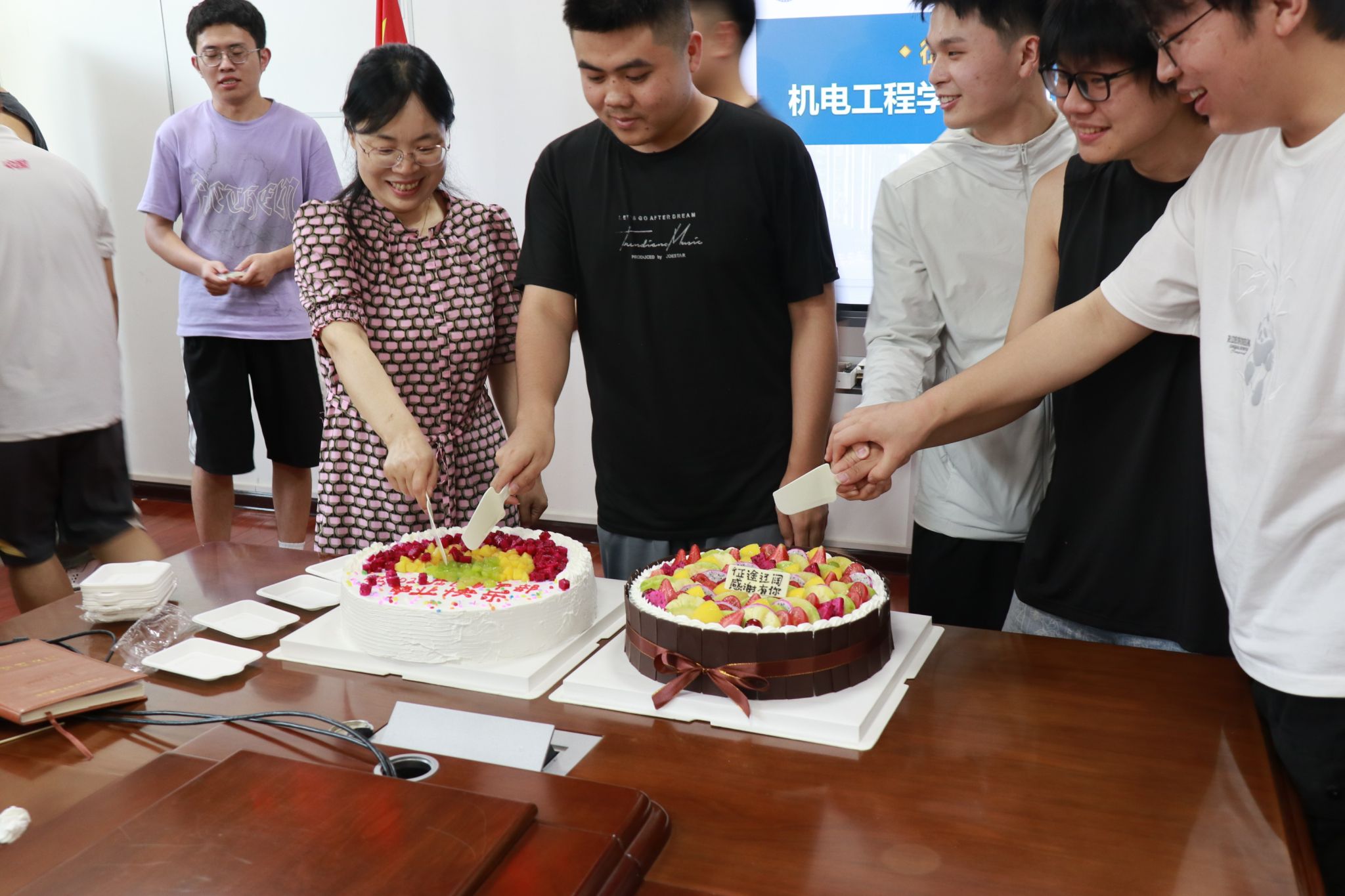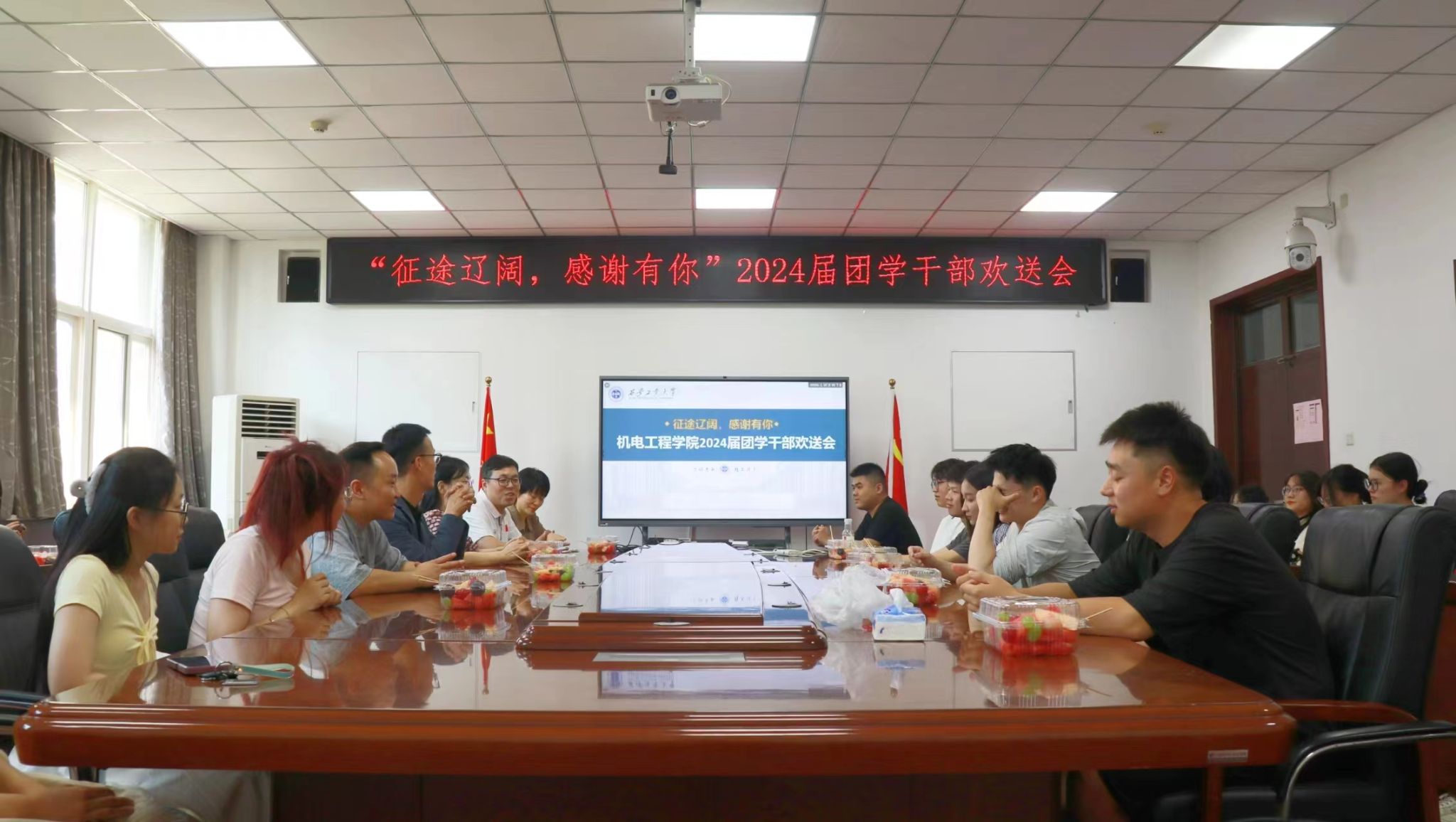 欢送会前,程新峰与姚敏茹代表公司为2024届员工干部代表们送上最诚挚的祝福,并感谢他们在公司担任员工干部期间所付出的辛勤努力。希望他们怀揣公司的祝福,勇担时代使命,在社会的大舞台上成就更大作为,铭记并践行校训校风,展现西安工大人的青春风采,母校和母院永远是毕业生的坚强后盾。马芳荣深情回顾了与24届员工相处四年的点点滴滴,并代表老师祝福毕业生前程似锦,希望他们常回母校看看。随后,毕业生们及低年级团学干部代表先后发言,从不同角度回顾了在公司团学工作的美好回忆,现场不时充斥着欢声笑语,又频频出现感动的泪点。座谈后,全体与会人员共同切蛋糕庆祝毕业时光,也在一块块蛋糕中体现出彼此作为机电人的凝聚力和向心力。聚是一团火,散作满天星,相信2024届团学干部必将乘风破浪,在中国式现代化的征程中挺膺担当。